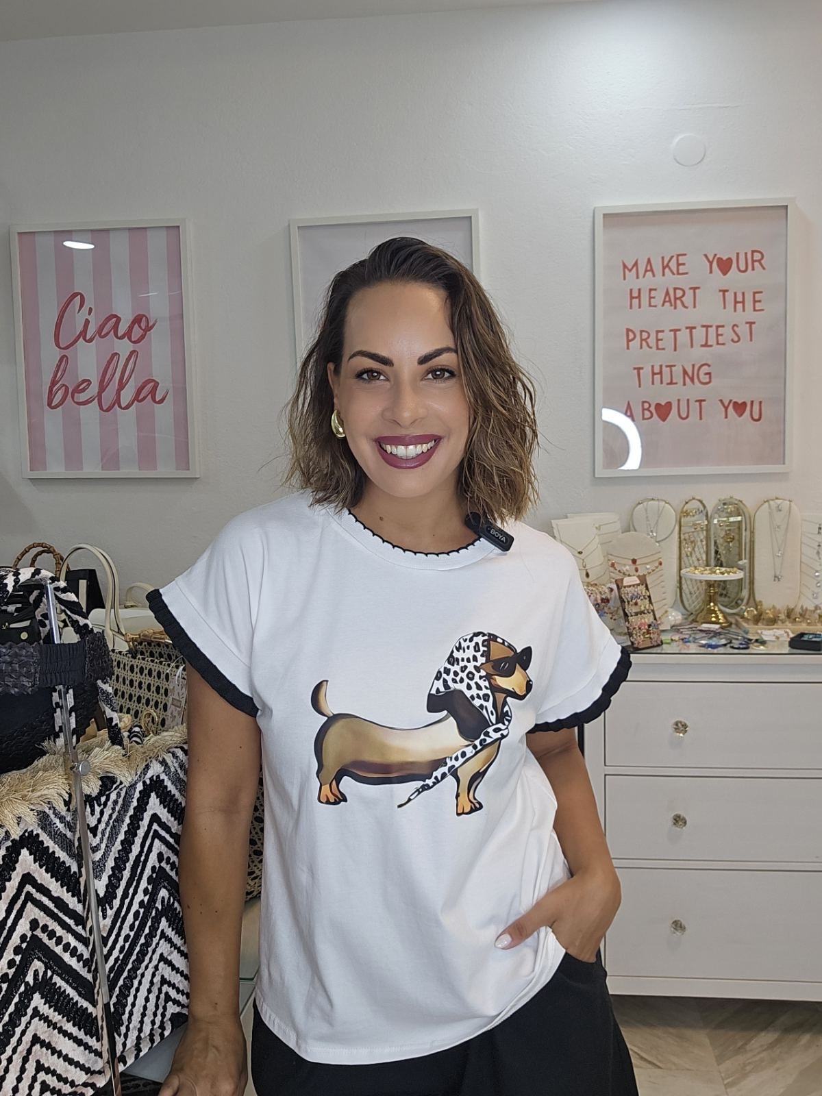 Λευκό T-shirt με chic dog print και μαύρες λεπτομέρειες, ιδανικό για playful αλλά κομψές εμφανίσεις.