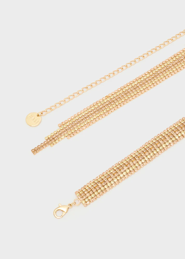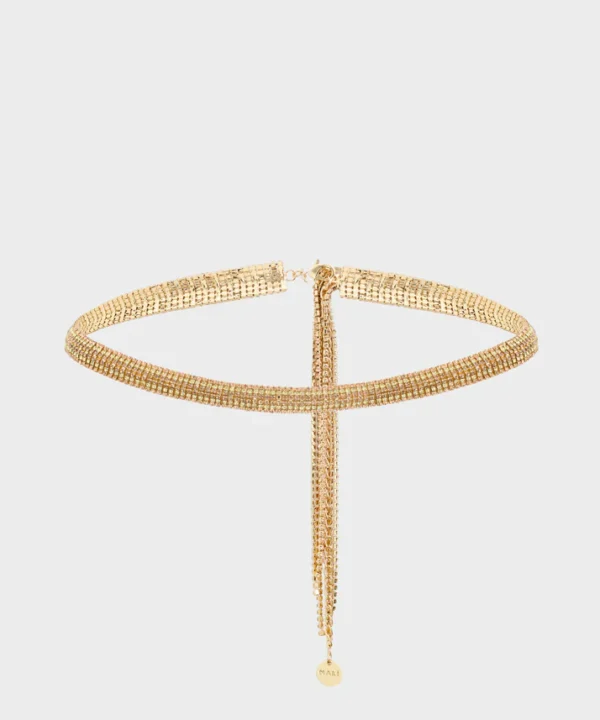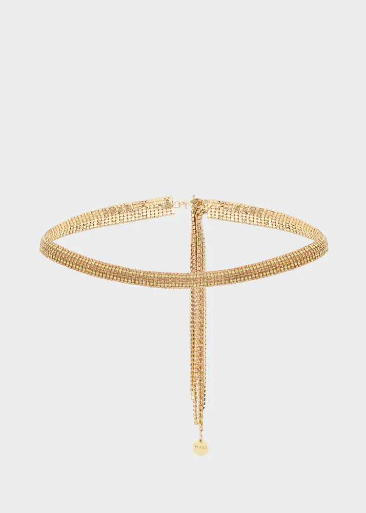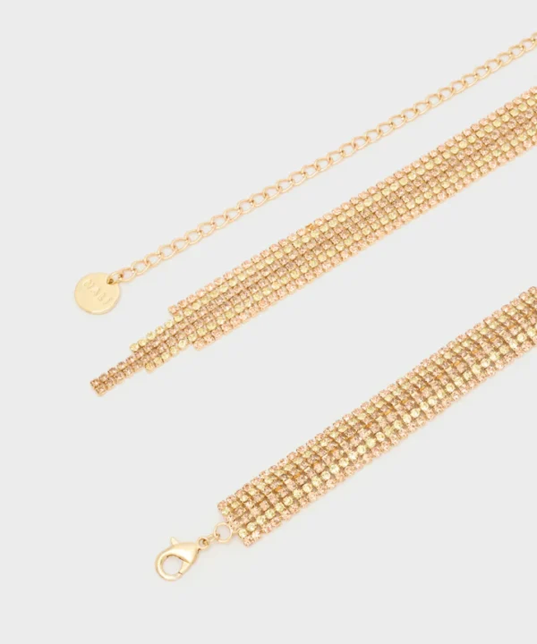 Ζώνη με διακοσμητικά μεταλλικά στοιχεία σε χρυσό τόνο, με σφυρήλατη υφή που αντανακλά διακριτικά το φως. Ένα κομψό αλλά ευέλικτο αξεσουάρ, ιδανικό για να ολοκληρώσει τόσο καθημερινά όσο και πιο sophisticated σύνολα, προσθέτοντας μια διακριτική λάμψη