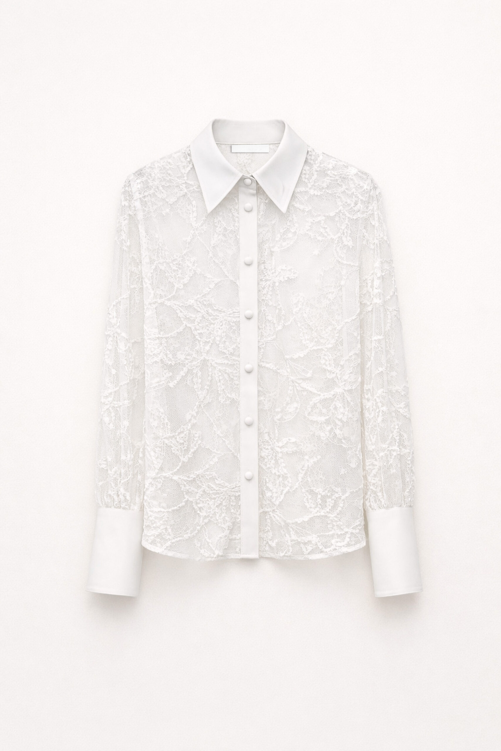 Πουκάμισο σε ρομαντική γραμμή από φίνα δαντέλα με ανάγλυφο floral σχέδιο που χαρίζει κομψότητα και διαχρονική θηλυκότητα. Το ύφασμα είναι ελαφρύ και διακριτικά διάφανο, δημιουργώντας sophisticated αποτέλεσμα χωρίς να βαραίνει το σύνολο.