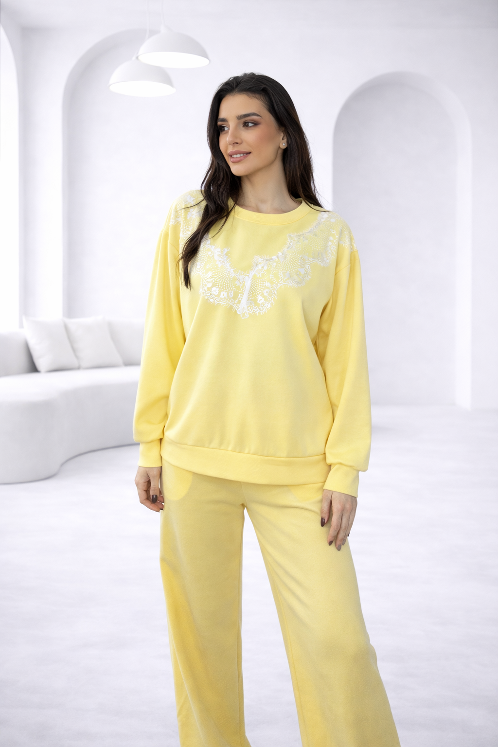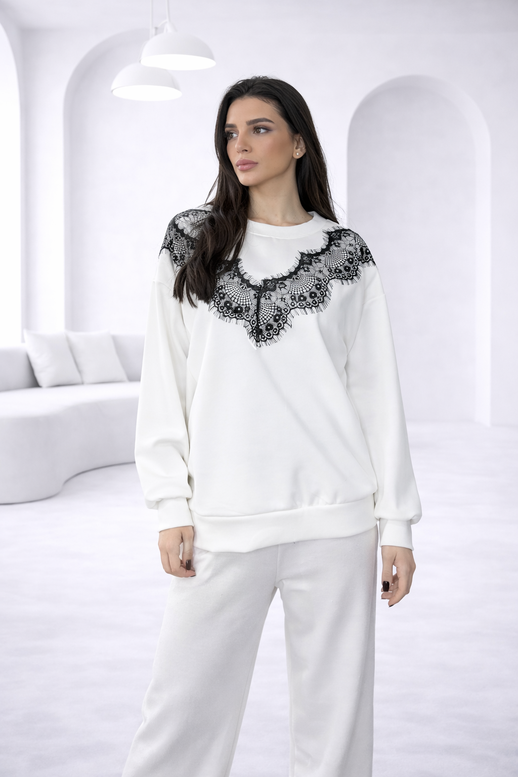 Σετ φόρμας σε απαλό, μαλακό ύφασμα με άνετη εφαρμογή και εξαιρετική αίσθηση στην επιδερμίδα. Η μπλούζα σε χαλαρή γραμμή διαθέτει στρογγυλή λαιμόκοψη και rib τελειώματα στα μανίκια και στο κάτω μέρος για σταθερή εφαρμογή. Η ιδιαίτερη λεπτομέρεια δαντέλας στο μπούστο προσθέτει θηλυκότητα και κομψότητα, μετατρέποντας το casual κομμάτι σε statement επιλογή.