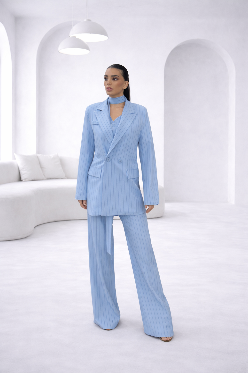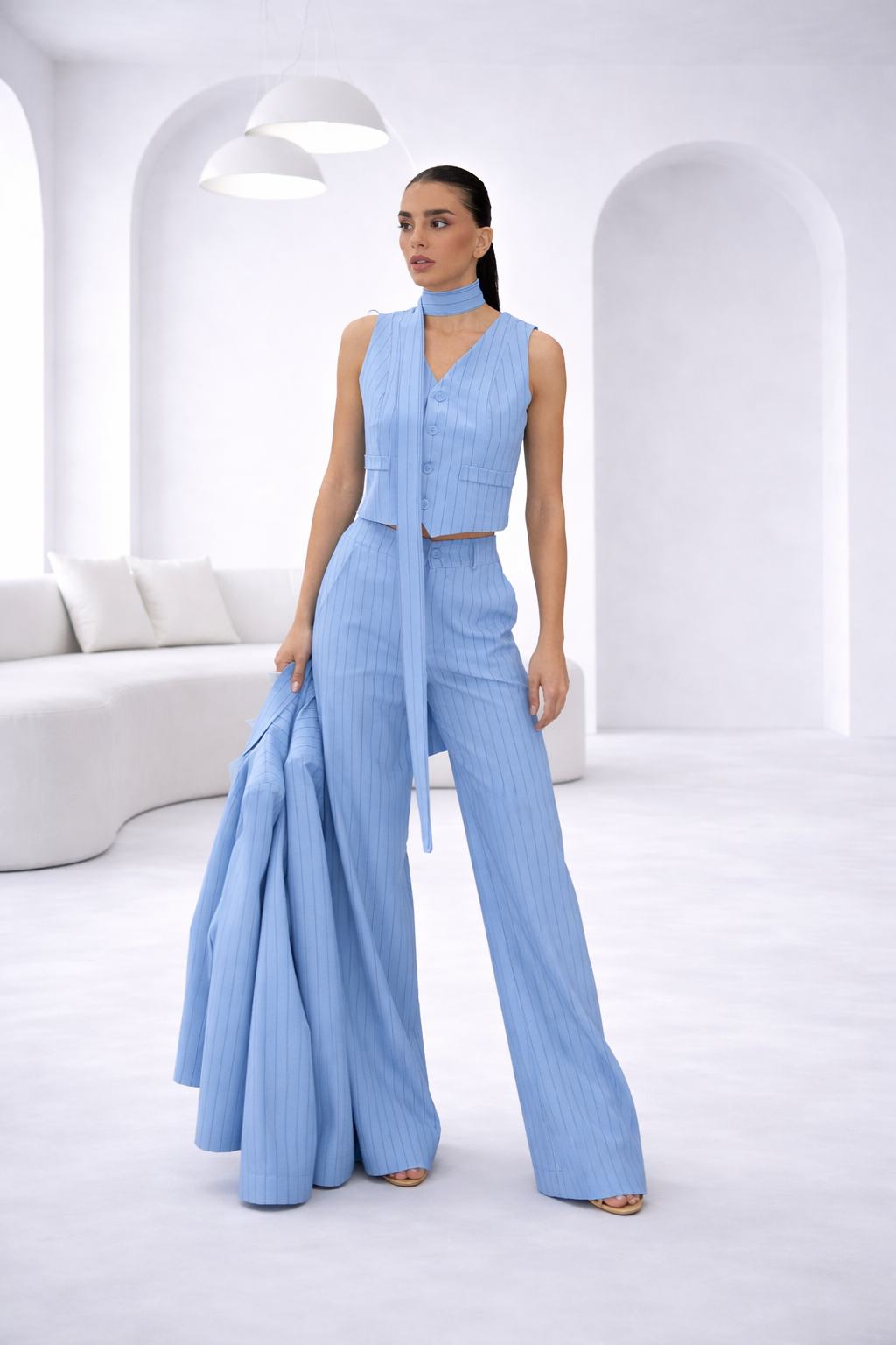 Ένα εκλεπτυσμένο κοστούμι σε απαλή γαλάζια απόχρωση, με διακριτική ριγέ υφή που αποπνέει σύγχρονη κομψότητα. Το σετ αποτελείται από tailored παντελόνι με άνετη, ίσια γραμμή και cropped γιλέκο με κουμπιά, που συνοδεύεται από μακρύ, ενσωματωμένο scarf για μια ιδιαίτερη πινελιά. Το σακάκι, με δομημένους ώμους και καθαρές γραμμές, ολοκληρώνει το look με refined αισθητική.