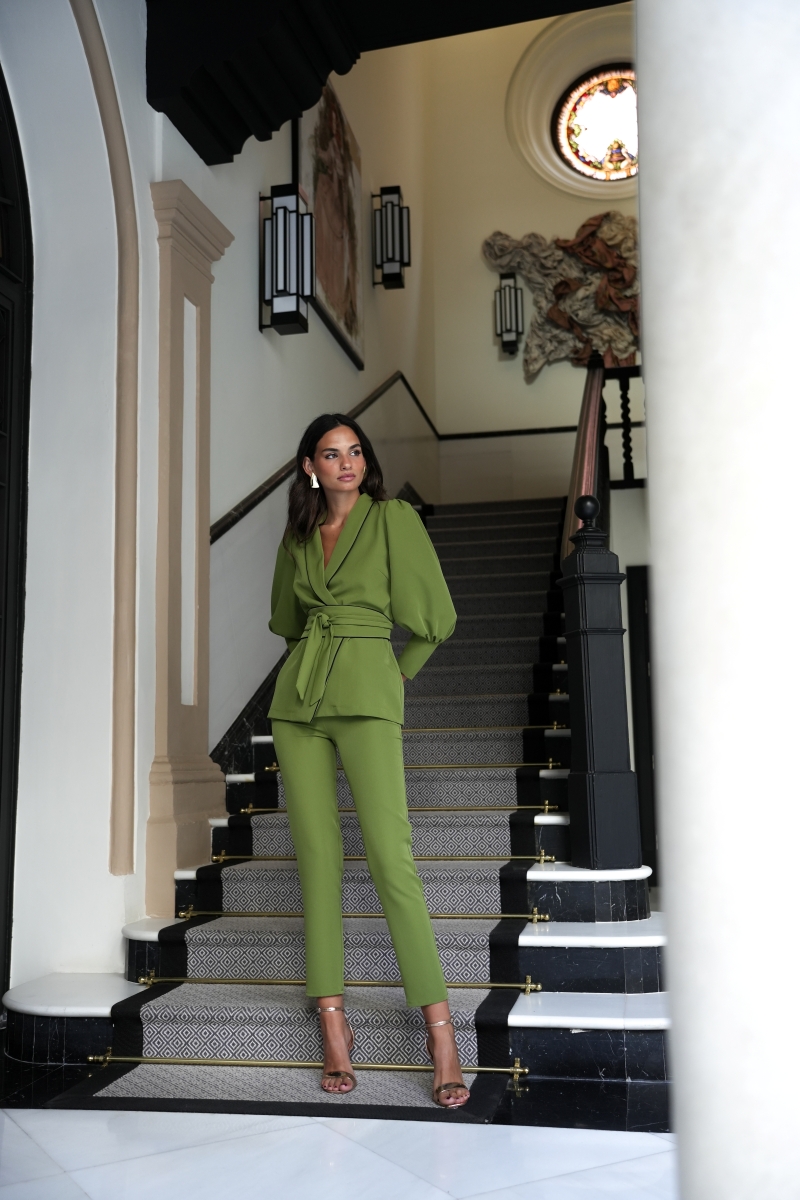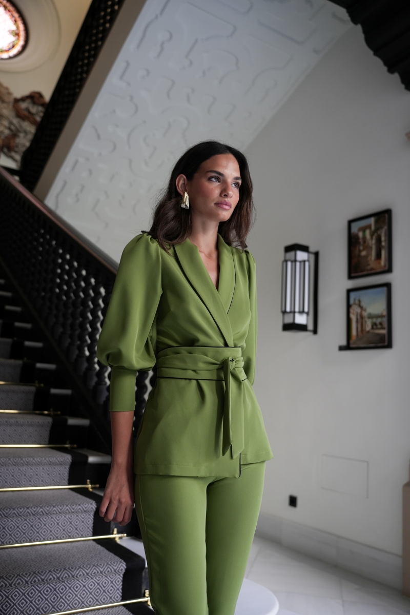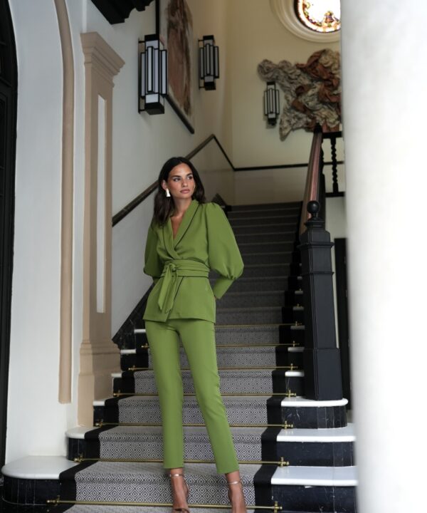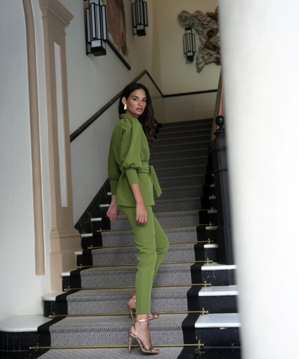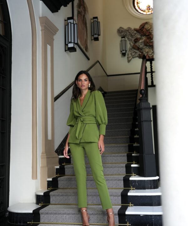 Το κοστούμι Siberia σε πράσινη απόχρωση αποτελεί ιδανική επιλογή για εμφανίσεις καλεσμένης με κομψό και σύγχρονο ύφος. Διαθέτει τοπ με φουσκωτά μανίκια που καταλήγουν σε μανσέτα και κλείσιμο με ζώνη/σας που αναδεικνύει τη μέση. Το σετ ολοκληρώνεται με παντελόνι σε στενή γραμμή και κλείσιμο με αόρατο φερμουάρ για καθαρό και εκλεπτυσμένο αποτέλεσμα