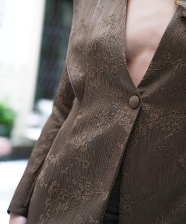 Το κοστούμι Zira από σατινέ ύφασμα με floral print αποπνέει κομψότητα και θηλυκότητα. Το σακάκι διαθέτει γιακά με πέτο και λαιμόκοψη V, ενώ οι διακριτικές λεπτομέρειες flap προσθέτουν δομή στο σχέδιο. Ολοκληρώνεται με εφαρμοστό παντελόνι σε στενή γραμμή και κλείσιμο με αόρατο φερμουάρ για ένα καθαρό και εκλεπτυσμένο αποτέλεσμα